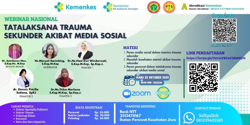 Pengurus Wilayah Ikatan Perawat Kesehatan Jiwa Indonesia Provinsi Nusa Tenggara Timur (PW IPKJI NTT) sukses menyelenggarakan webinar nasional bertema “Tatalaksana Trauma Sekunder Akibat Media Sosial”, Rabu (22/10/2025). Kegiatan ini menjadi bagian dari rangkaian peringatan Hari Kesehatan Jiwa Sedunia (HKJS) 2025 yang digelar oleh IPKJI NTT.